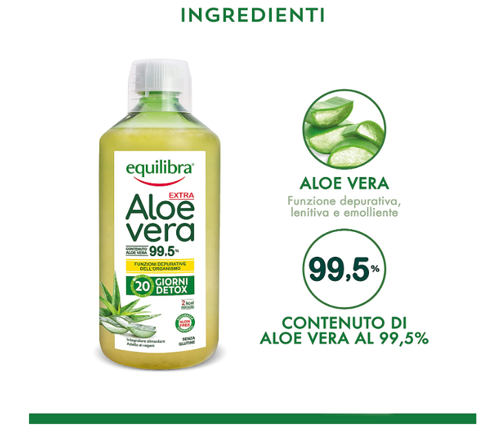 Equilibra Integratori Alimentari, Aloe Vera Extra 99,5%, Integratore Aloe Vera da Bere Puro o Diluito, Aloin Free, Detox, Pura Polpa, Senza Aggiunta di Acqua, Prodotto Vegano, Senza Glutine, 1 Litro