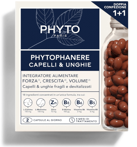 Integratore alimentare che dona forza e vitalità a capelli e unghie fragili. Trattamento completo della durata di 3 mesi; due confezioni da 90 capsule
